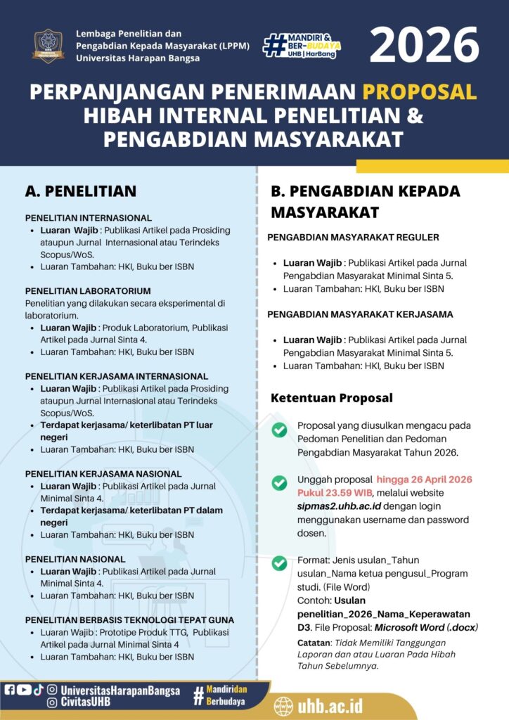 PENGUMUMAN PERPANJANGAN PENERIMAAN PROPOSAL HIBAH INTERNAL PENELITIAN DAN PENGABDIAN KEPADA MASYARAKAT TAHUN 2026